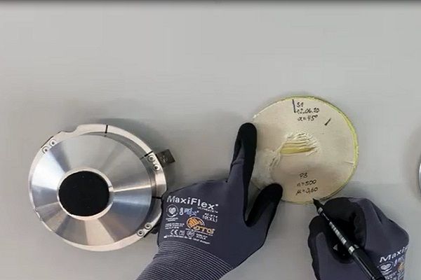 设备的工作原理相当巧妙:它将平移滑动过程转移到缩放旋转系统中。测试时,三个材料样品被安装在样品支架上,这个支架连接到位于混凝土瓷砖(模拟路面)上方的旋转样品载体的三个臂上。电动机将样品载体加速到预定的转速,此时样品还未接触混凝土瓦片。一旦达到目标速度,电机关闭,转子释放到混凝土瓦片上。就像真正的事故中一样,当测试样品接触混凝土瓦片表面后,摩擦力使转子减速,直到完全停止。